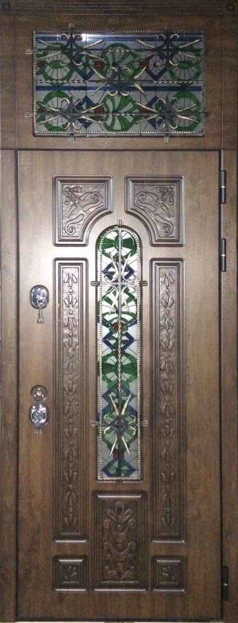Металлическую дверь из корабельной фанеры можно декорировать ковкой и стеклом, витражом, зеркальными вставками. При установки такой двери в коттедж, стоит рассмотреть вариант изготовления двери с терморазрывом. Это позволит не делать в доме холодный тамбур, но при этом сохранить в доме тепло.