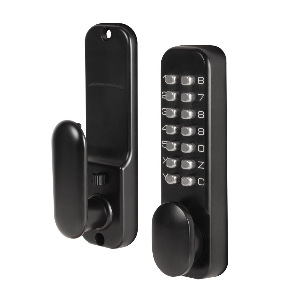 Замок перекодируемый. Материал изготовления корпуса - ZAMAK, механизма и ригеля - сталь. Цвет: черный. Упаковка: коробка. Комплектация: корпус и накладка замка, резиновые уплотнители, защелка, отвтная планка, карточка с кодовой комбинацией, набор крепежа, набор для смены комбинации секретности.