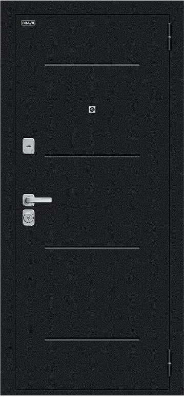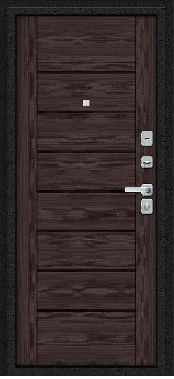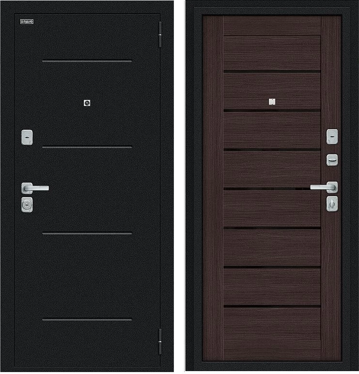Надежная входная Дверь Браво Техно/BChrome Букле черное/Wenge Melinga премиум класса по цене 37 150 руб. Большая толщина стали защитит от проникновения в ваш дом, квартиру или коттедж. Используется очень качественная фурнитура: замки, цилиндры, ручки, защелки. Покрытие и отделка двери изготовлено под внимательным контролем производителя. Дверь имеет долгий срок службы и гарантию.